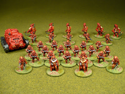I've finished painting my Human Imperial Army from 15mm.co.uk. Here are some pics, just click on them for a larger view. (I don't know why the thumbnails look scrunched, but the full-size view is fine.)